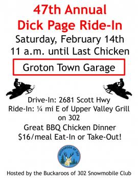 47th Annual Dick Page Ride-In will be held on Saturday, February 14th, 2026 from 11am till the last chicken is sold. Location is at the Groton Town garage, 1/4 mile east of Upper Valley Grill & General Store, 2681 Scott Highway, Groton, VT 05046.